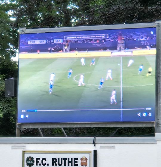 Ruthe(jd). Der FC Ruthe lädt während der EM zum Public Viewing in den Jahn-Sport-Park ein. Sämtliche deutschen und türkischen EM-Spiele werden live auf einer 8 qm großen LED-Leinwand gezeigt. Bis zum Donnerstagabend hatten Vereinsmitglieder und Freunde des Vereins an den technischen Problemen gearbeitet. Diese sind beseitigt, Vereinspräsident und Initiator der Veranstaltung Walter Drescher freut sich auf zahlreiche Besucher. Der Eintritt ist frei, für das leibliche Wohl der Fans ist gesorgt.